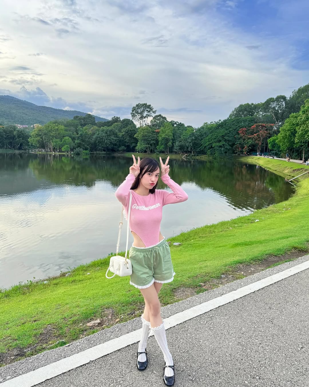 บรรยากาศเย็นๆ กับลุคสดใสของ ‘เก๋ไก๋ สไลเดอร์’ ณ อ่างเก็บน้ำ มหาวิทยาลัยเชียงใหม่ กลายเป็นไวรัลอีกครั้งในชุดชมพูพาสเทลที่มีข้อความ Gentlewoman สะดุดตา พร้อมกางเกงเขียวลายทางสุดคิวต์ และถุงเท้ายาวลูกไม้ที่เติมความละมุนให้กับลุคได้อย่างลงตัว